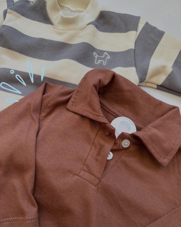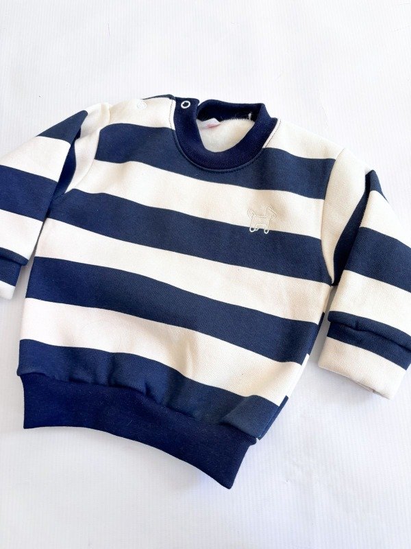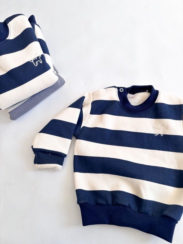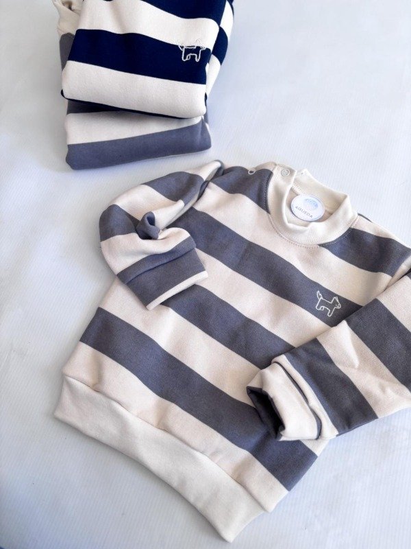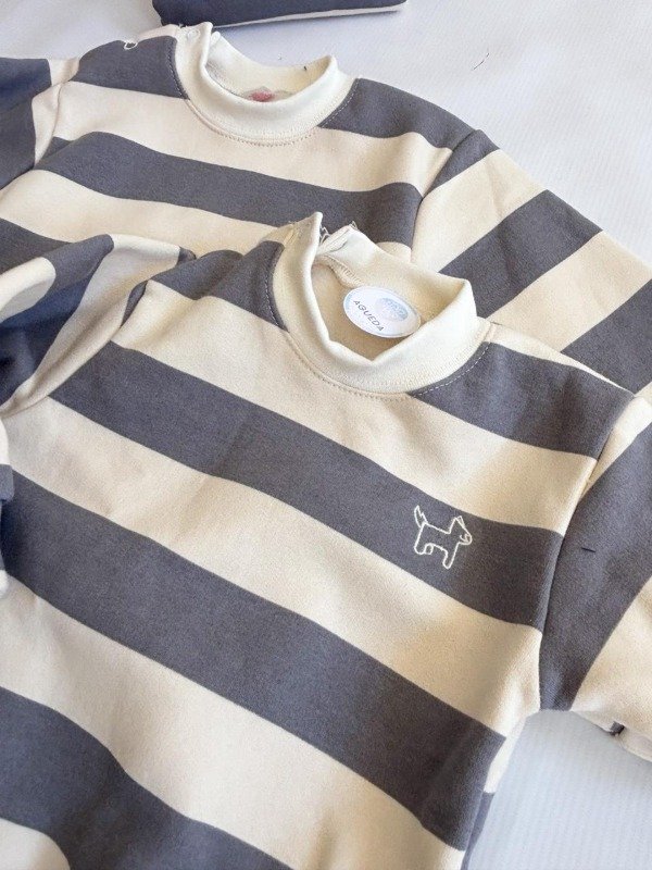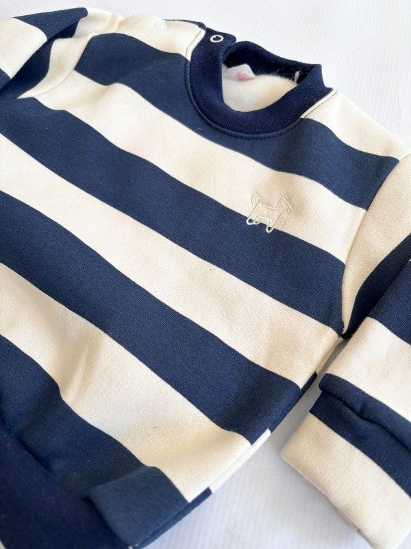 Buzo rayado, frizado con pequeño perrito bordado que le da un toque original y cuello redondo con dos broches.