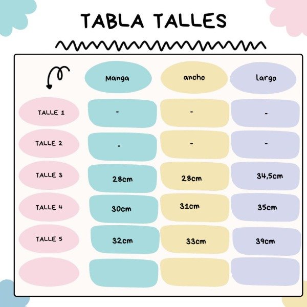 (Cada prenda está medida a mano, una por una, para que puedas elegir el talle idela para tu bebé. Sabemos que no siempre la edad condice con el tamaño, por eso te recomendamos guiarte por la tablita)