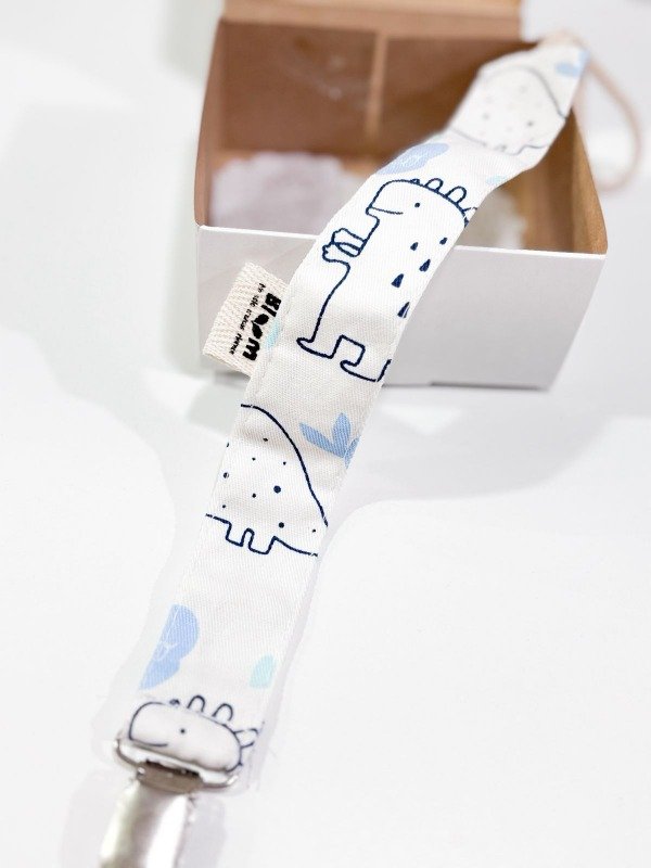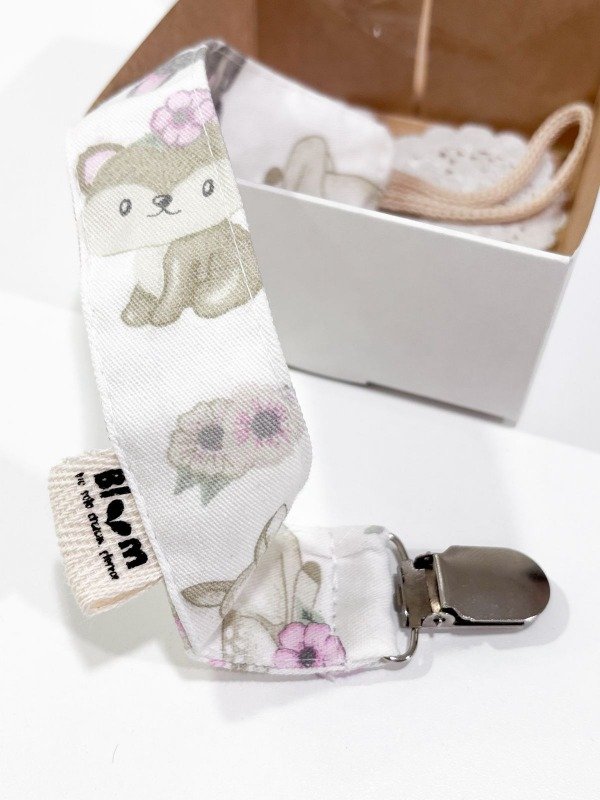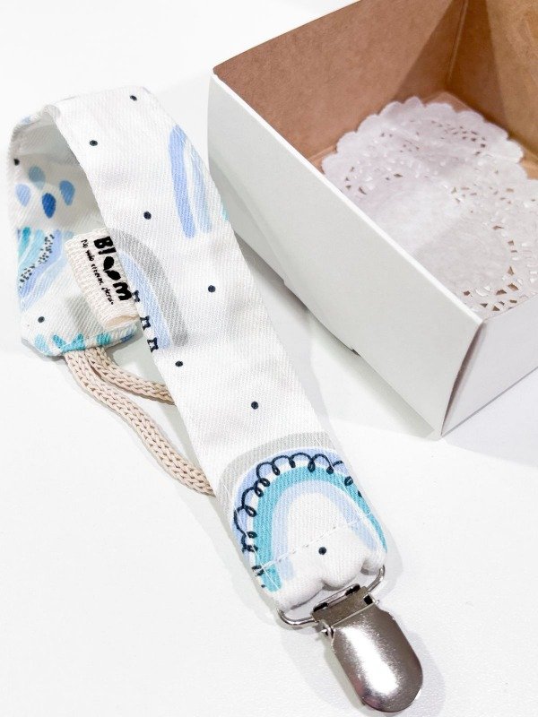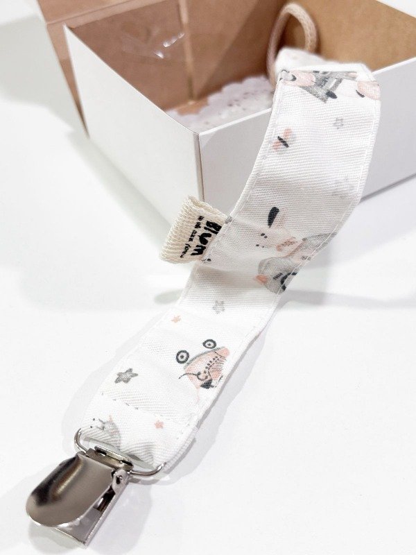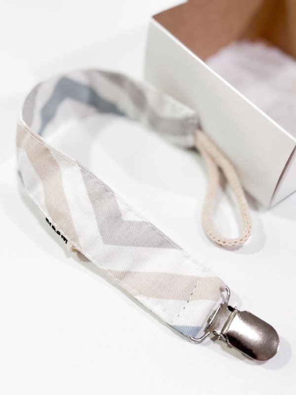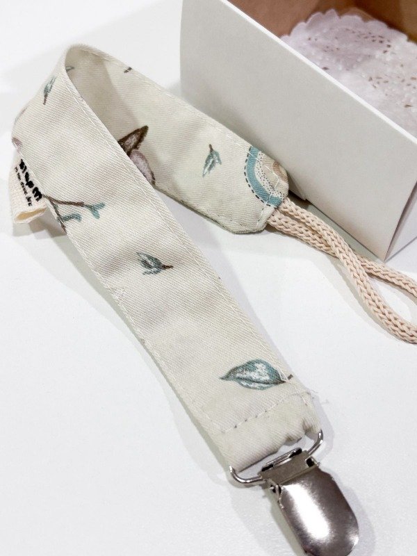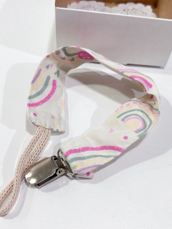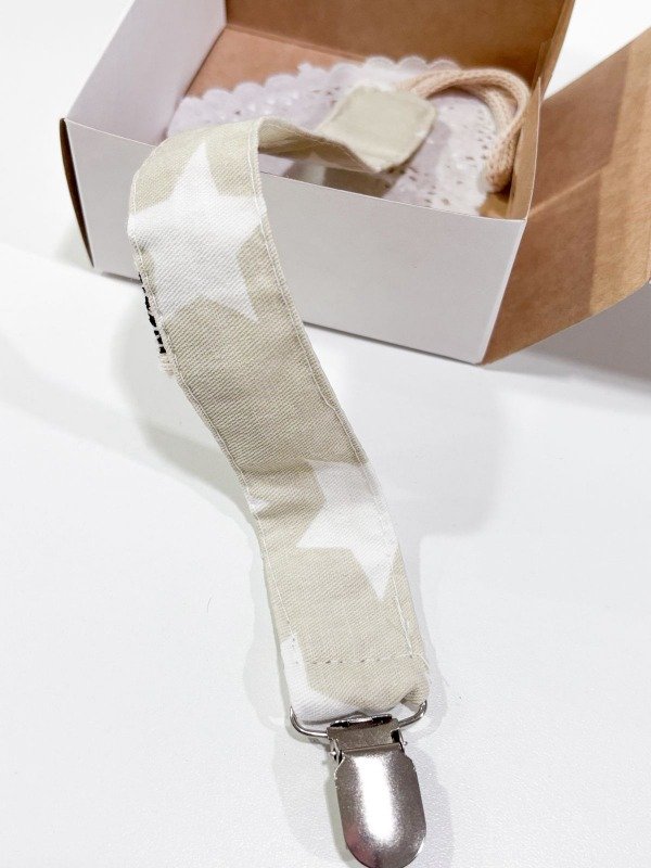 Portachupetes de tela, con broche metálico, viene en cajita