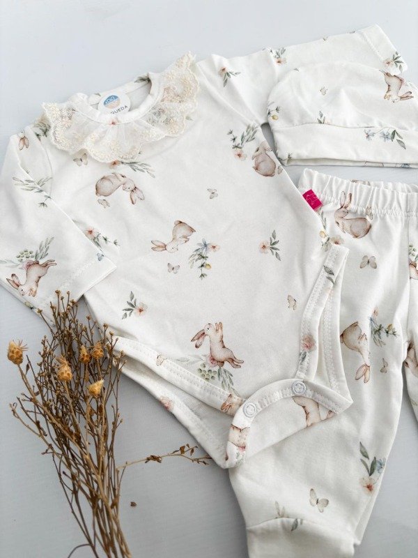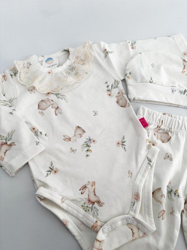 Ajuar de algodón pima con estampa de conejitos y flores